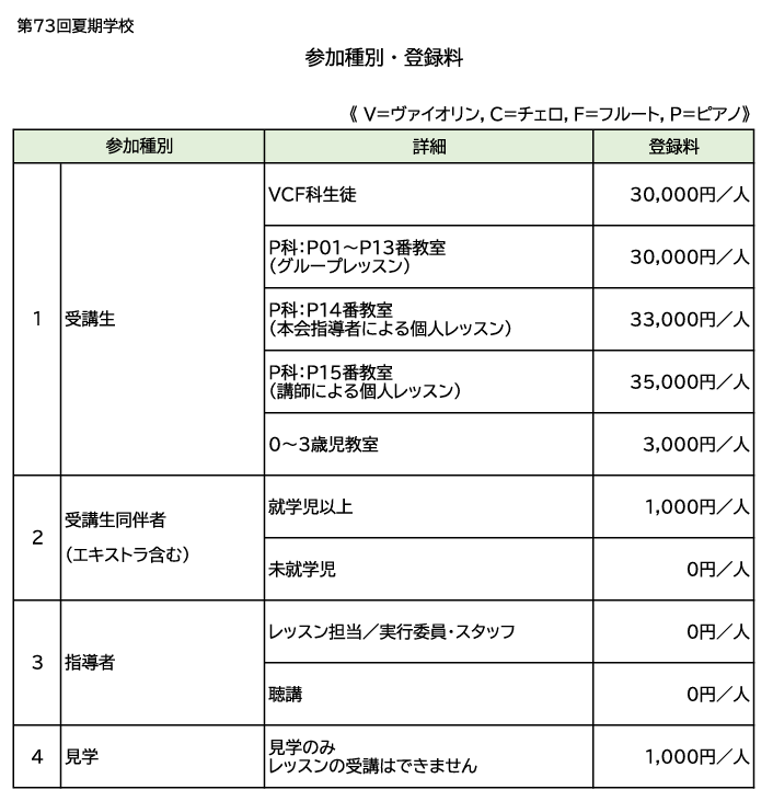・VCF科教室別レッスンとP科マスタークラスには定員があります。