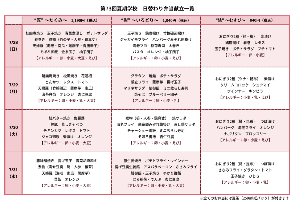 *いずれのお弁当にも麦茶(250ml紙パック)が付きます。