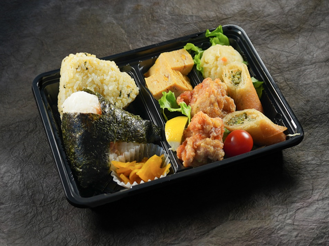 2種のおにぎりと人気のおかずを盛り合わせた、お手頃なお弁当